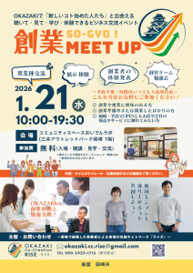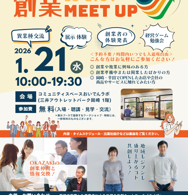 これを受けて、急遽、卒業生有志メンバーとともに「OKAZAKI co creation RISE(岡崎 コ・クリエーション ライズ)」という任意グループを立上げ、「交流・報告・勉強・展示」を盛り込んだ創業イベント【創業MEETUP↑】を企画。地元で創業間もない事業者を中心に10出展者も集まってくれ、2026年1月21日に開催することができました(岡崎市からの後援もいただきました)。会場は、開業まもない三井アウトレットパーク岡崎の貸会場「おいでんラボ」でした。