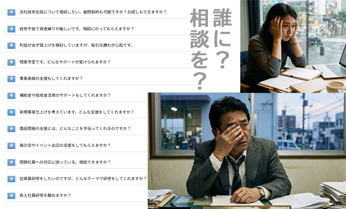 経営をしていて「困った・・・」「実現したいけれど課題がある・・・」そんな時には、まずはお気軽に「初回無料相談」をご利用ください。