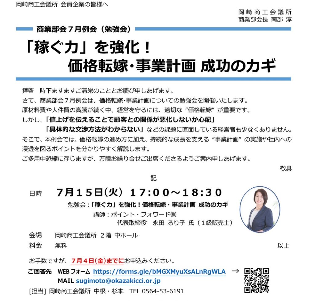 ・岡崎商工会議所商業部会主催「稼ぐ力を強化!価格転嫁・事業計画 成功のカギ」実施(2025年7月)